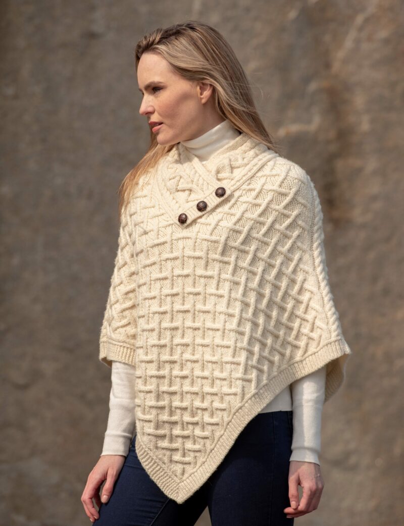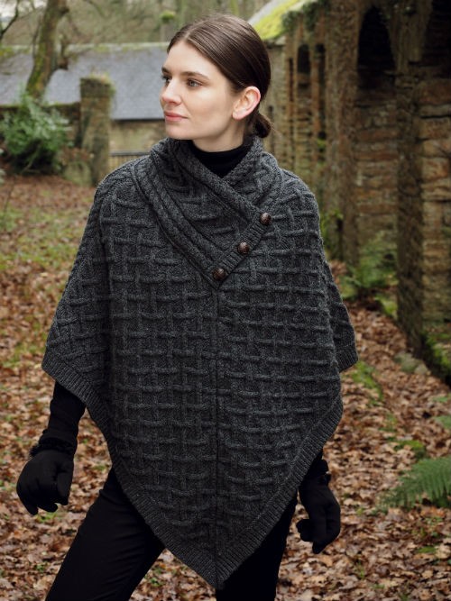 The aran poncho is a perfect stable for every wardrobe and the supersoft merino wool allows you wear it all through the seasons.
