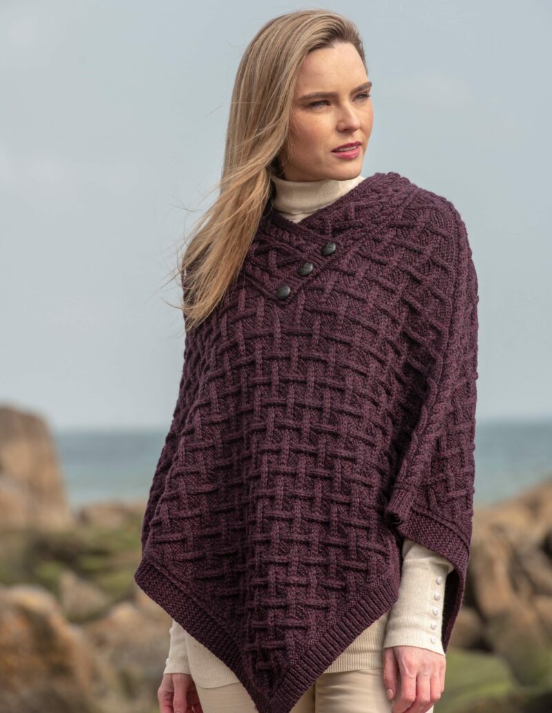 The traditional aran cable lattice pattern is featured on the front and back of the cape.