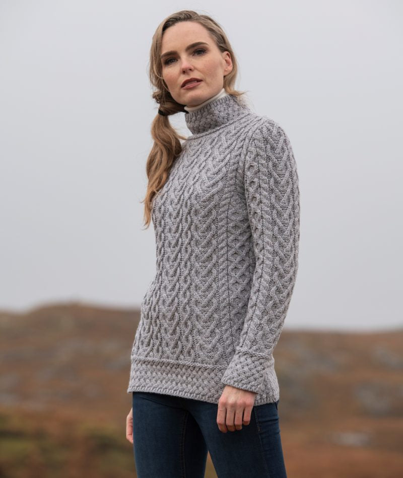 Luxurious ladies cable knit  sweater knitted using 100% super soft merino wool.  This beautiful ladies cable knit sweater is a mix of a very unique heart design pattern though the body of the sweater and complimented with the traditional honeycomb and cable stitch patterns.  The high neck is knitted with the traditional basket stitch design matching the hem beautifully, creating a very feminine and opulent sweater.
