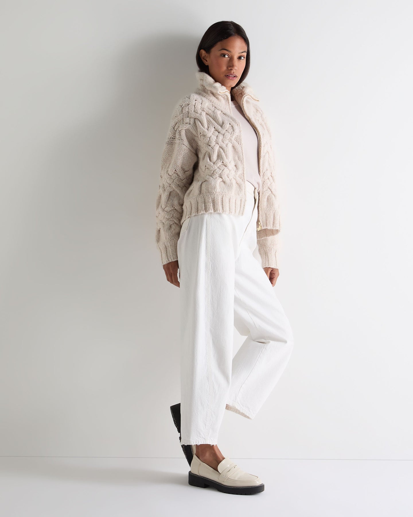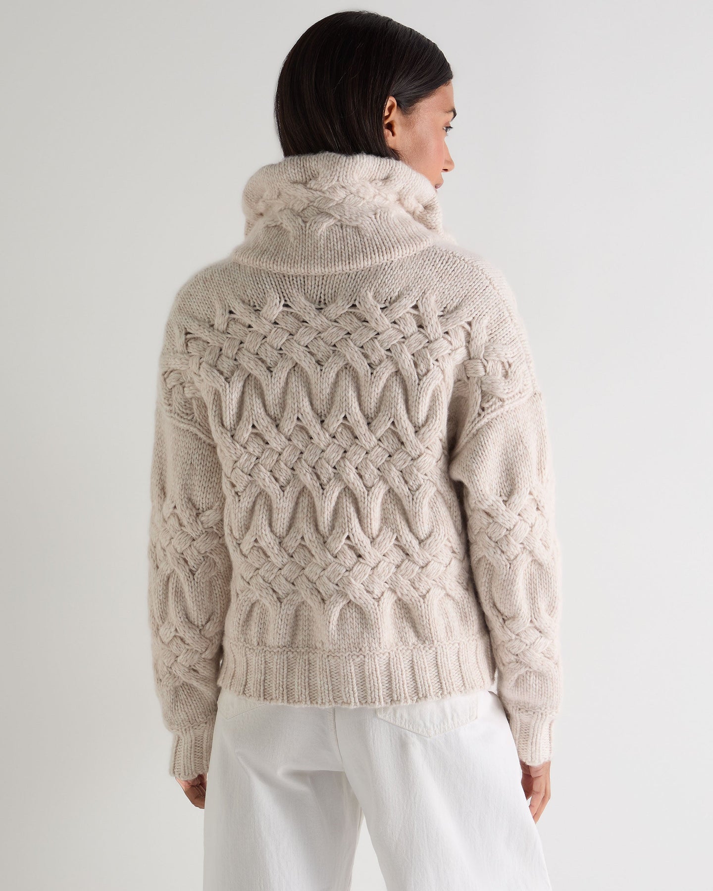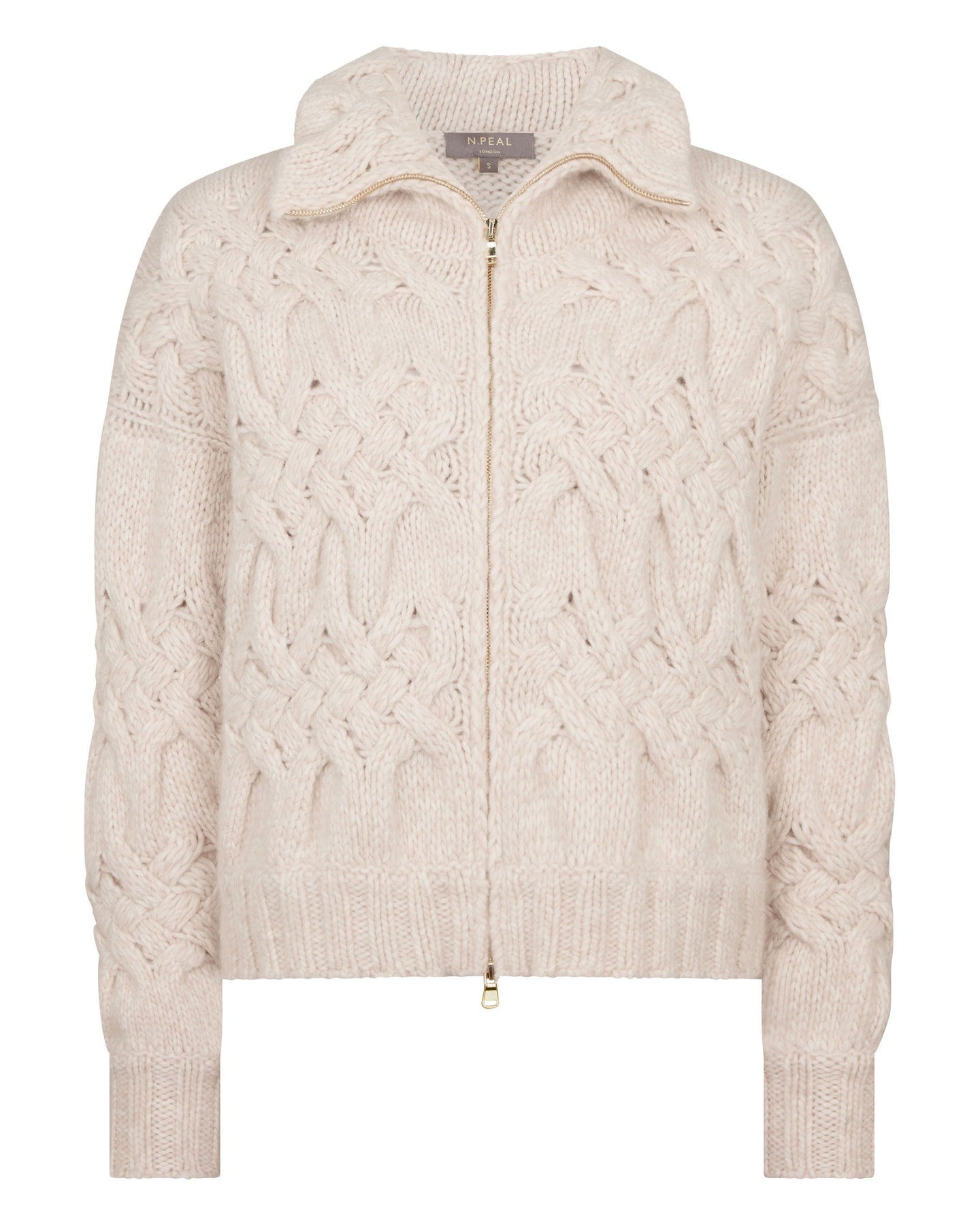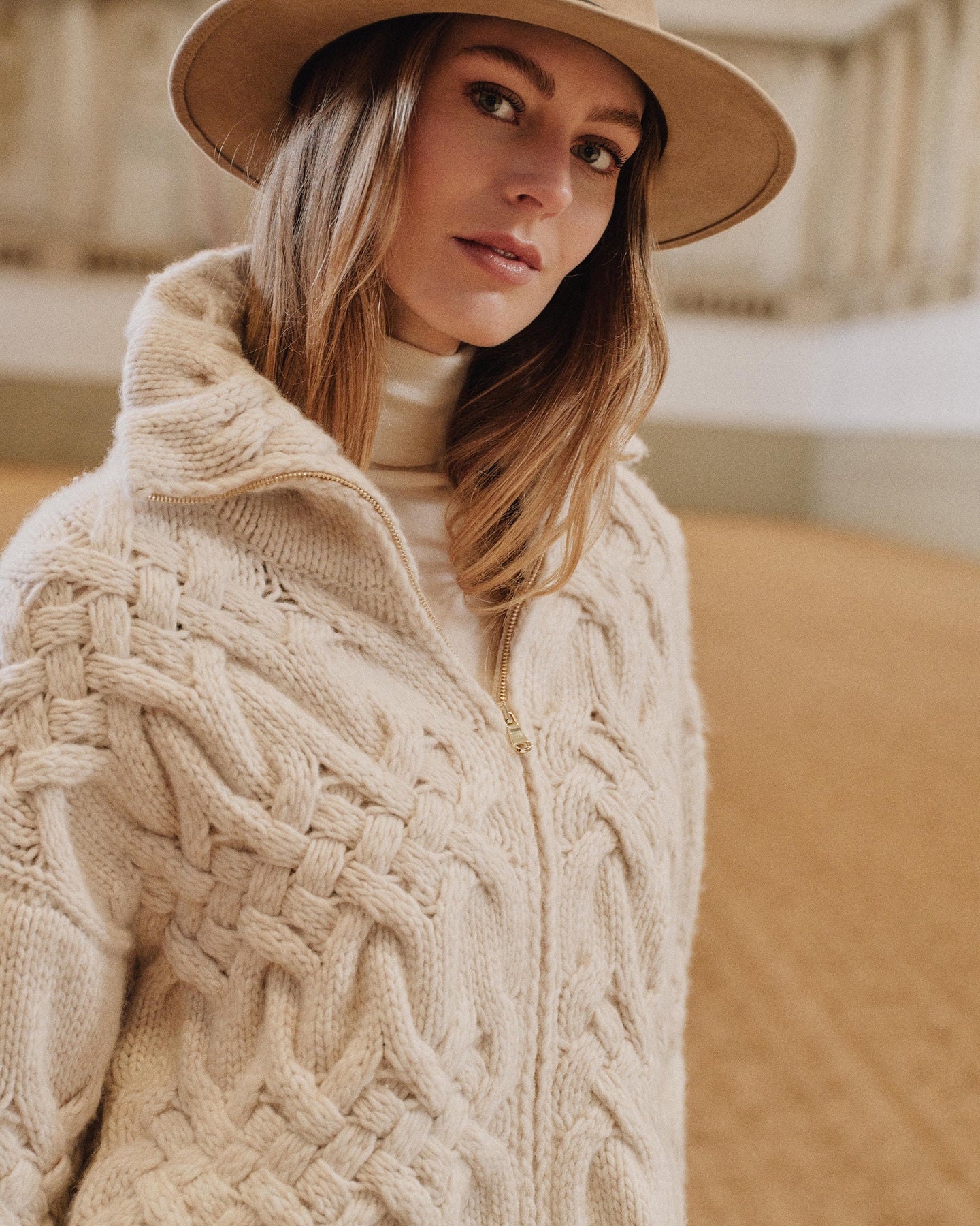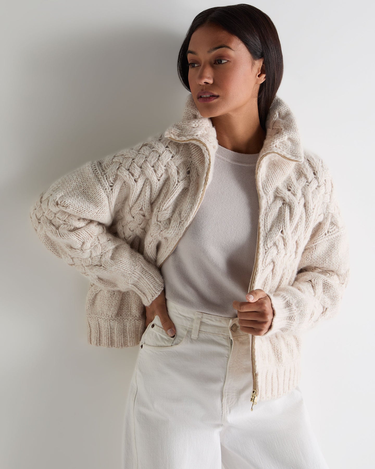 An elevated take on a winter cashmere classic, this chunky zip-through cashmere sweater makes a statement in texture and silhouette. Crafted in 10-ply organic cashmere, the oversized cable knit delivers bold structure without losing an ounce of softness. The stand collar and ribbed trims keep things refined, while the double-ended gold-tone zip brings a subtle shine. A luxurious cold-weather hero, built to wear well beyond the season.